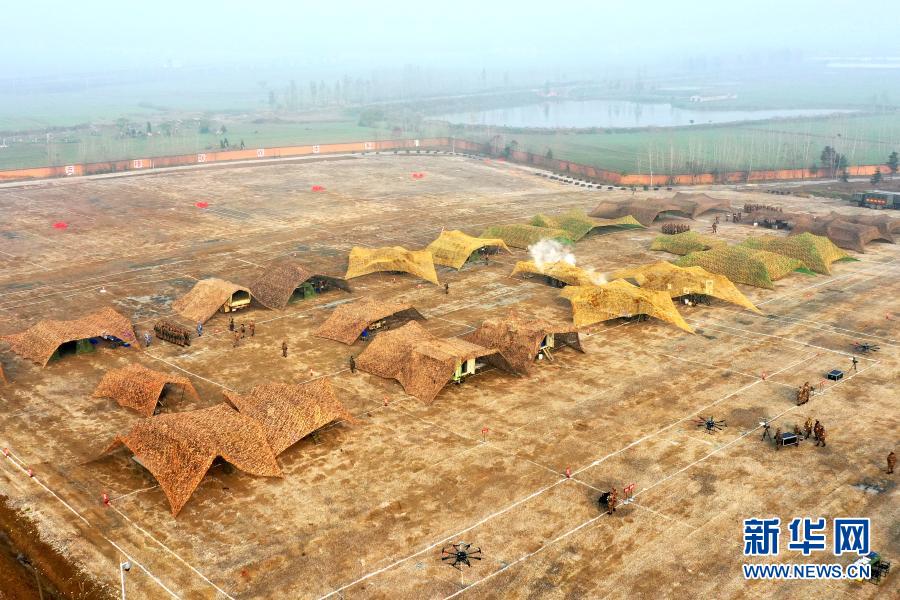 飲食保障隊(duì)參賽隊(duì)員在偽裝網(wǎng)下的炊事車內(nèi)加工野戰(zhàn)快餐,并利用無(wú)人機(jī)前送(11月29日攝,無(wú)人機(jī)照片)。新華社發(fā)(姜梓涵 攝)