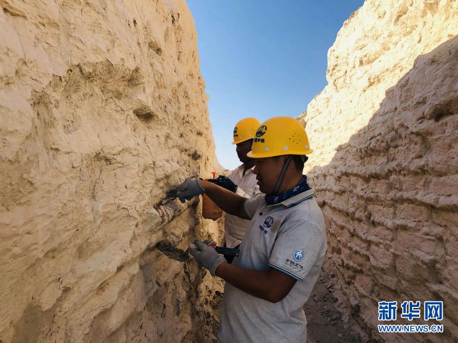 文物保護(hù)工作者在樓蘭古城內(nèi)搶險加固三間房遺址(9月12日攝)。新華社發(fā)