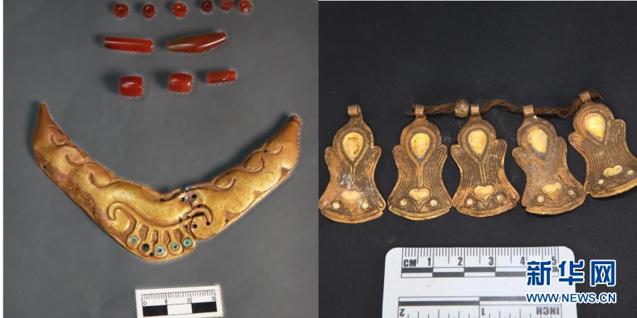 桑達(dá)隆果墓地出土的金項(xiàng)飾、瑪瑙等(資料照片)。新華社發(fā)