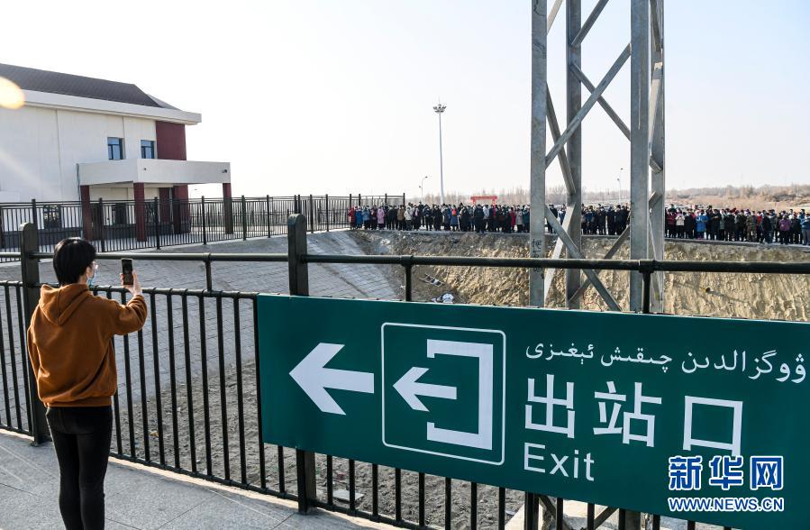 12月9日,在位于新疆尉犁縣境內(nèi)的庫爾木依站,當?shù)鼐用褡园l(fā)地來到車站外圍觀列車。新華社記者 王菲 攝
