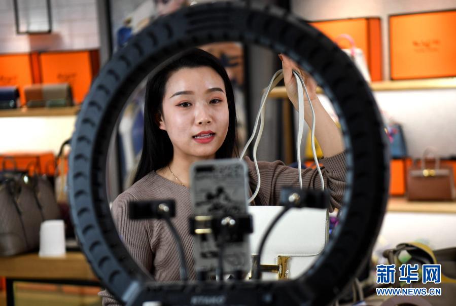 12月11日,河北保定白溝新城一家箱包生產(chǎn)企業(yè)的主播在進行產(chǎn)品推介和銷售。新華社記者 王曉 攝
