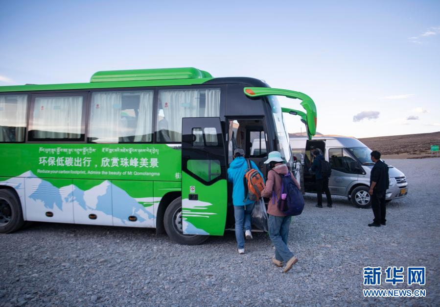 游客在珠穆朗瑪峰景區(qū)停車場(chǎng)轉(zhuǎn)乘環(huán)??蛙嚕?019年5月16日攝)。珠穆朗瑪峰景區(qū)內(nèi)自2019年5月開始試運(yùn)營(yíng)清潔能源環(huán)保客車,以進(jìn)一步平衡珠峰地區(qū)旅游發(fā)展與環(huán)境保護(hù)需要。新華社記者 孫非 攝