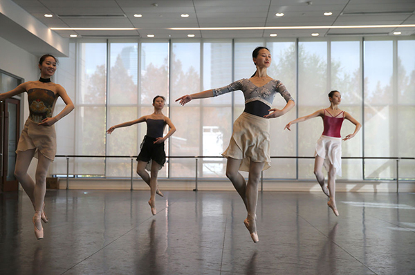 12月15日,項(xiàng)陽(右二)和同伴在上海芭蕾舞團(tuán)排練廳里排練。