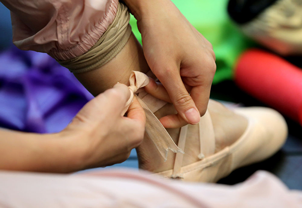 12月15日,項(xiàng)陽在基礎(chǔ)訓(xùn)練課前綁足尖鞋。