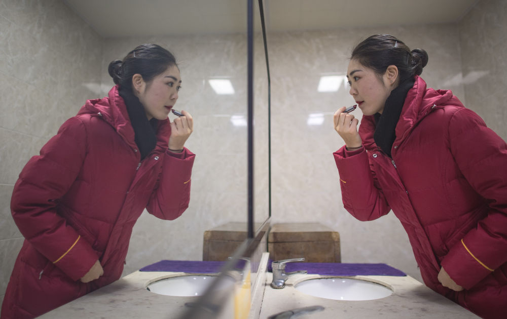 ??12月16日,武漢客運段高鐵乘務(wù)員艾婷婷在上班前化妝。
