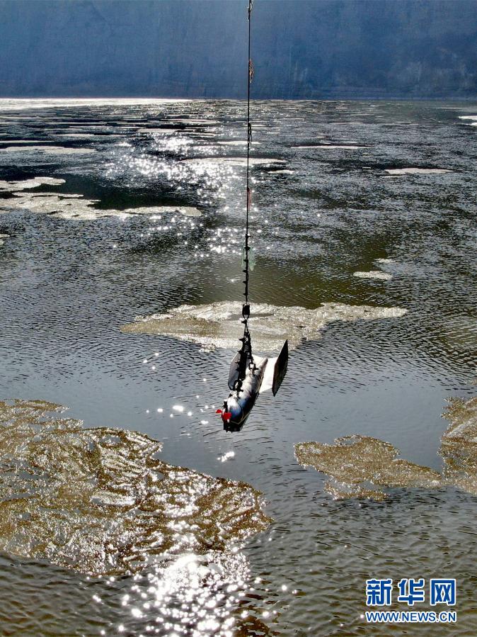 龍門水文站工作人員利用鉛魚纜道進行流量測驗(12月27日攝,無人機照片)。新華社記者 劉詩平 攝