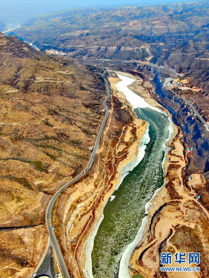 壺口瀑布至龍門水文站之間的黃河(12月26日攝,無人機照片)。新華社記者 劉詩平 攝