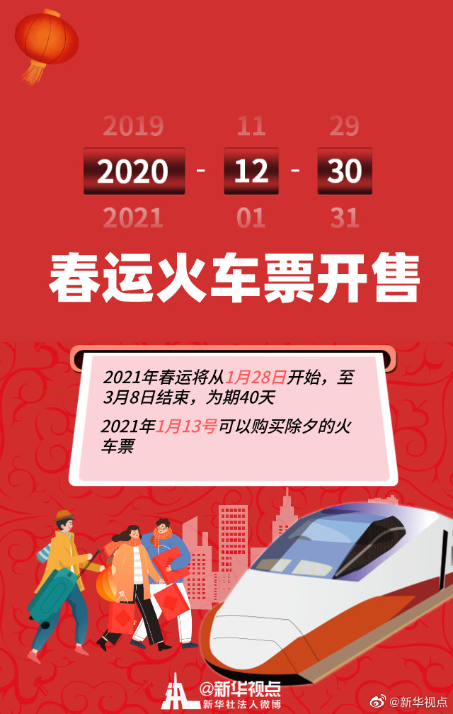 12月30日,2021年春運(yùn)火車(chē)票正式開(kāi)始發(fā)售。2021年春運(yùn)將從1月28日開(kāi)始,至3月8日結(jié)束,為期40天。不知道你做好出行計(jì)劃了嗎?說(shuō)到買(mǎi)票,讓小編為你敲重點(diǎn):1月13日前后可以購(gòu)買(mǎi)除夕前后的火車(chē)票;想安安靜靜旅行,你可以選擇靜音車(chē)廂;票沒(méi)搶到,你可以通過(guò)“候補(bǔ)購(gòu)票”功能試試運(yùn)氣。考慮疫情原因,建議有條件的旅客錯(cuò)峰出行,避開(kāi)春運(yùn)高峰期,出行時(shí)做好防護(hù)措施,全程佩戴口罩。(記者 樊曦 周圓)