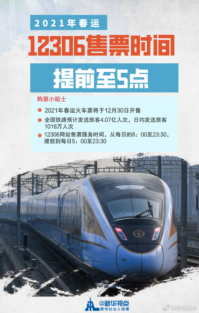 2021年鐵路春運自1月28日開始,3月8日結(jié)束,共40天,全國鐵路預(yù)計發(fā)送旅客4.07億人次,日均發(fā)送旅客1018萬人次。據(jù)悉,鐵路部門將鐵路12306網(wǎng)站售票服務(wù)時間從每日的6:00至23:30,提前到每日5:00至23:30;同步12306網(wǎng)站和線下窗口改簽規(guī)則,線上也可改簽乘車當(dāng)日24點前其他列車車票。(記者樊曦、周圓)?