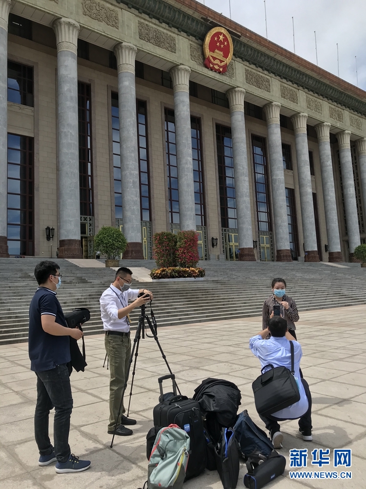 5月20日,全國政協(xié)十三屆三次會議召開新聞發(fā)布會。大會新聞發(fā)言人郭衛(wèi)民向中外媒體介紹本次大會有關(guān)情況并回答記者提問。圖為本網(wǎng)記者在人民大會堂東門外廣場做直播前準(zhǔn)備工作。新華網(wǎng)記者 周紅軍? 攝