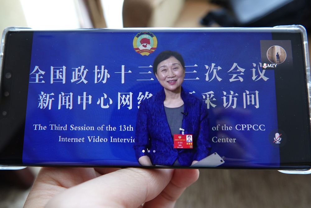 20日,記者通過手機觀看全國政協(xié)委員接受采訪。