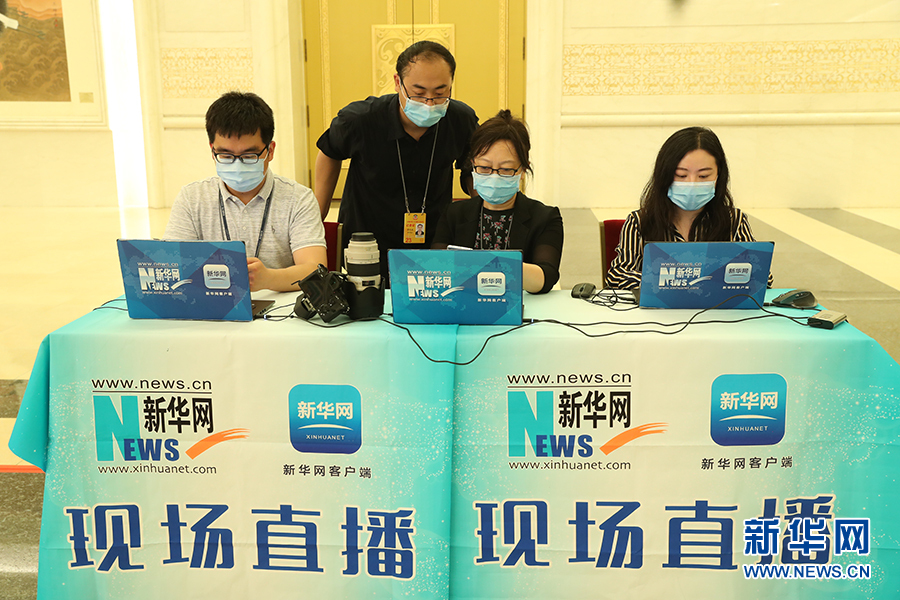 2020年5月28日下午十三屆全國人大三次會(huì)議閉幕后,國務(wù)院總理李克強(qiáng)在人民大會(huì)堂三樓金色大廳出席記者會(huì)并回答中外記者提問。為有效防控疫情,共同維護(hù)公共衛(wèi)生與健康,記者會(huì)采用網(wǎng)絡(luò)視頻形式進(jìn)行。圖為新華網(wǎng)現(xiàn)場直播團(tuán)隊(duì)。 新華網(wǎng) 王翰林 攝