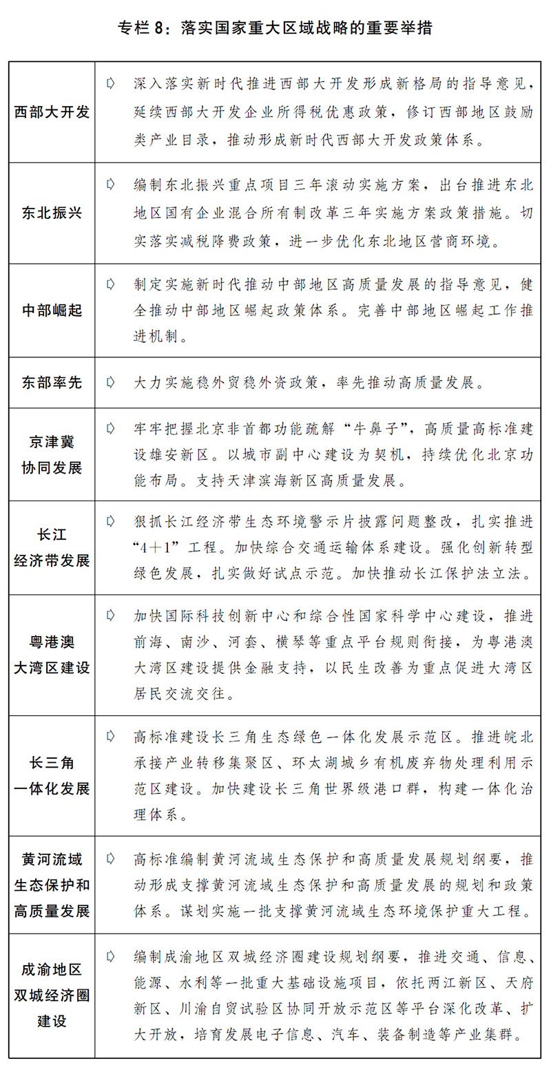 一是落實落細(xì)重大區(qū)域發(fā)展戰(zhàn)略。落實區(qū)域協(xié)調(diào)發(fā)展新機制,持續(xù)推進西部大開發(fā)形成新格局,支持東北地區(qū)全面振興全方位振興,健全中部地區(qū)崛起政策體系和工作機制,繼續(xù)推動?xùn)|部地區(qū)率先發(fā)展??v深推進京津冀協(xié)同發(fā)展,加快實施雄安新區(qū)重點建設(shè)項目,完善北京非首都功能疏解政策體系。大力推進長江經(jīng)濟帶生態(tài)環(huán)境突出問題整改和系統(tǒng)性保護修復(fù),加快構(gòu)建綜合交通運輸體系,促進內(nèi)河船舶改造。推動粵港澳大灣區(qū)基礎(chǔ)設(shè)施互聯(lián)互通,有序開展國際科技創(chuàng)新中心建設(shè),加快橫琴、河套等重大合作平臺建設(shè)。高標(biāo)準(zhǔn)建設(shè)長三角生態(tài)綠色一體化示范區(qū),推動長三角交通一體化更高質(zhì)量發(fā)展,建設(shè)虹橋國際開放樞紐。抓緊做好黃河流域生態(tài)保護和高質(zhì)量發(fā)展規(guī)劃綱要編制和出臺實施工作。大力支持成渝地區(qū)雙城經(jīng)濟圈建設(shè),打造全國高質(zhì)量發(fā)展的重要增長極。積極推進西部陸海新通道建設(shè)。深化對口支援。支持少數(shù)民族和民族地區(qū)加快發(fā)展。推動國家級新區(qū)、開發(fā)區(qū)等功能平臺創(chuàng)新提升發(fā)展,加快推進資源型地區(qū)經(jīng)濟轉(zhuǎn)型和老工業(yè)城市更新改造。推動山西開展能源革命綜合改革試點。繼續(xù)推進承接產(chǎn)業(yè)轉(zhuǎn)移示范區(qū)建設(shè),在具備條件的內(nèi)陸城市打造一批高端制造業(yè)基地。制定發(fā)展海洋經(jīng)濟加快建設(shè)海洋強國的意見。完善主體功能區(qū)戰(zhàn)略和制度,編制《全國國土空間規(guī)劃綱要(2021-2035)》。