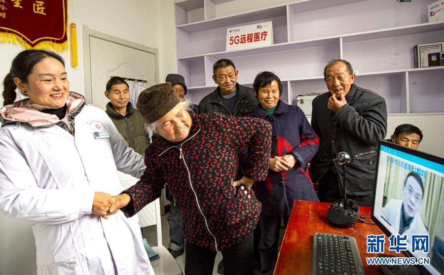 2020年12月3日,安徽省金寨縣大灣村村民方臨芳(左二)指著自己身體疼痛的部位,在村醫(yī)袁玲(左一)的幫助下向5G遠(yuǎn)程醫(yī)療會(huì)診的專家講述病情。