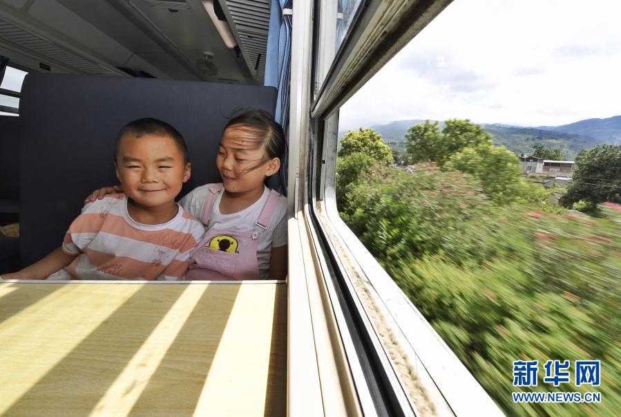 2020年8月14日,吳思語(右)帶著弟弟吳思遠(yuǎn)乘坐“小慢車”前往西昌走親戚。穿越四川涼山彝族自治州往返于普雄和攀枝花之間的5633/5634次列車,全列13節(jié)車廂,走滿全程353公里需要9個(gè)多小時(shí)。慢悠悠的火車沿途要???6個(gè)站,如同一座流動(dòng)的村莊,盡自己最大能力解決沿途百姓出行問題。