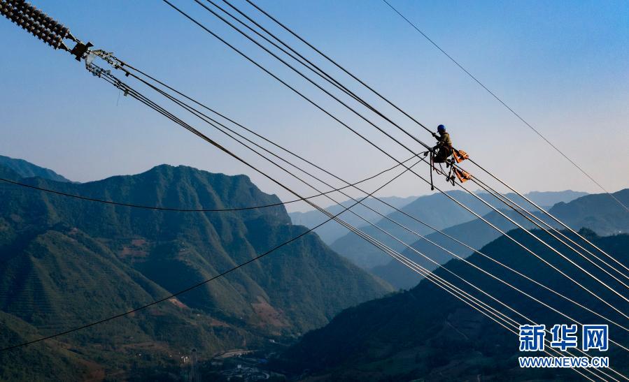 2020年5月3日,施工方國(guó)網(wǎng)四川電力送變電建設(shè)有限公司的員工在秦嶺之巔的高空緊線(無人機(jī)照片)。