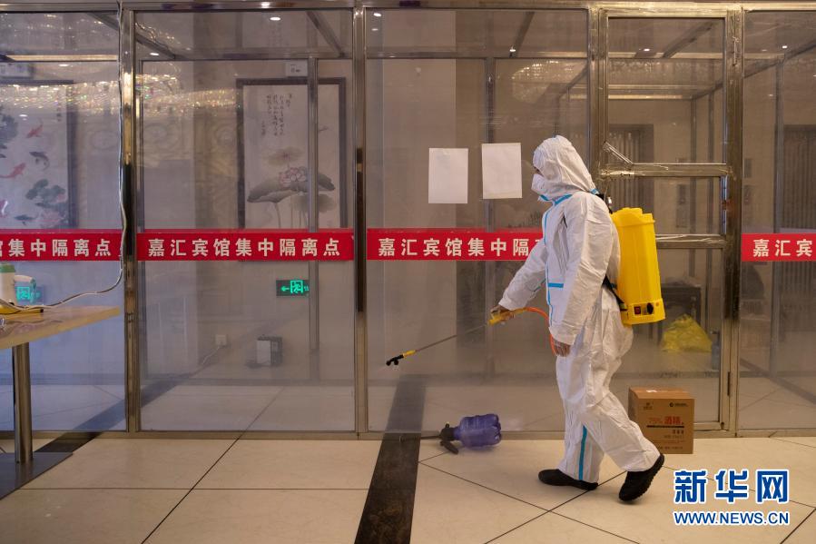 1月15日,隔離點(diǎn)醫(yī)護(hù)人員在望奎縣嘉匯酒店集中隔離點(diǎn)進(jìn)行消殺作業(yè)。 新華社發(fā)(張濤 攝)