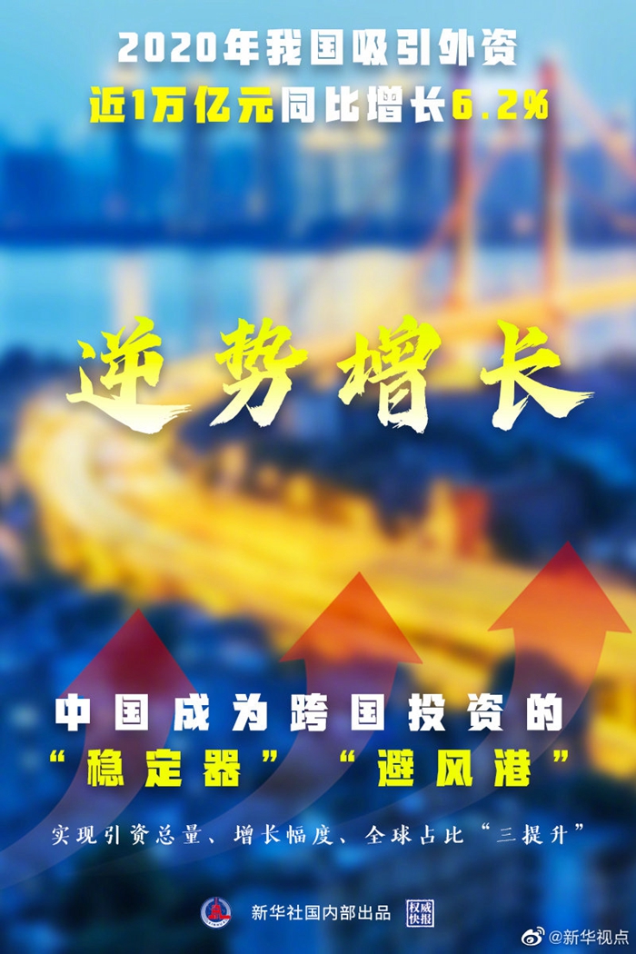新冠肺炎疫情沖擊下,全球跨國投資大幅下降,中國引資卻逆勢增長。商務(wù)部1月20日發(fā)布數(shù)據(jù)顯示,2020年我國非金融領(lǐng)域?qū)嶋H使用外資9999.8億元人民幣,同比增長6.2%,實現(xiàn)了引資總量、增長幅度、全球占比“三提升”。中國成為跨國投資的“穩(wěn)定器”和“避風(fēng)港”。(記者于佳欣)?