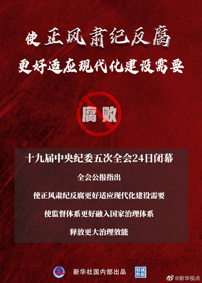 24日,十九屆中央紀(jì)委五次全會閉幕。全會公報指出:使正風(fēng)肅紀(jì)反腐更好適應(yīng)現(xiàn)代化建設(shè)需要,使監(jiān)督體系更好融入國家治理體系,釋放更大治理效能。(記者:朱基釵、孫少龍;海報設(shè)計:朱舜) ????