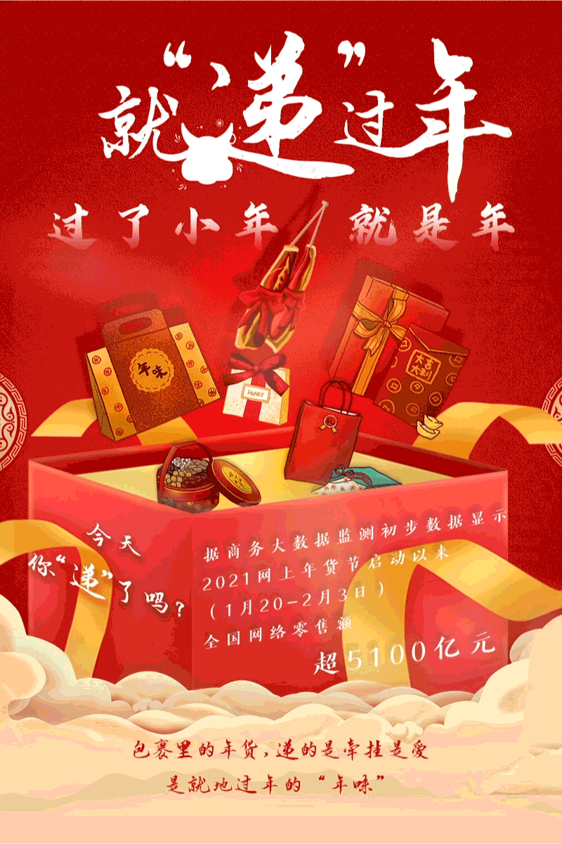 就地過年,年味不減。商務(wù)部2月4日發(fā)布數(shù)據(jù),由商務(wù)部等部門指導(dǎo)開展的“2021年全國網(wǎng)上年貨節(jié)”,自1月20日啟動(dòng)以來,全國網(wǎng)絡(luò)零售額已超5100億元?!霸啤辟從曦?,就“遞”過年,成為人們的新年俗。(記者于佳欣、王雨蕭,設(shè)計(jì)張晨光)