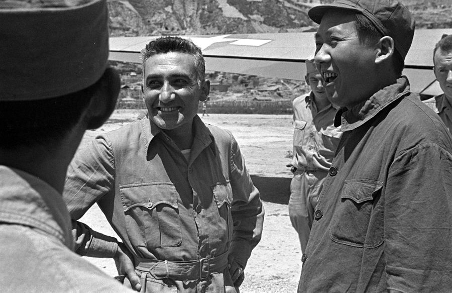 1944年,毛澤東同志和馬海德在延安。在抗日戰(zhàn)爭和解放戰(zhàn)爭期間,馬海德曾接待過許多到延安訪問的外國記者、外交官、軍人,包括1944年駐華美軍司令史迪威將軍派駐延安的美軍觀察組。 新華社圖片