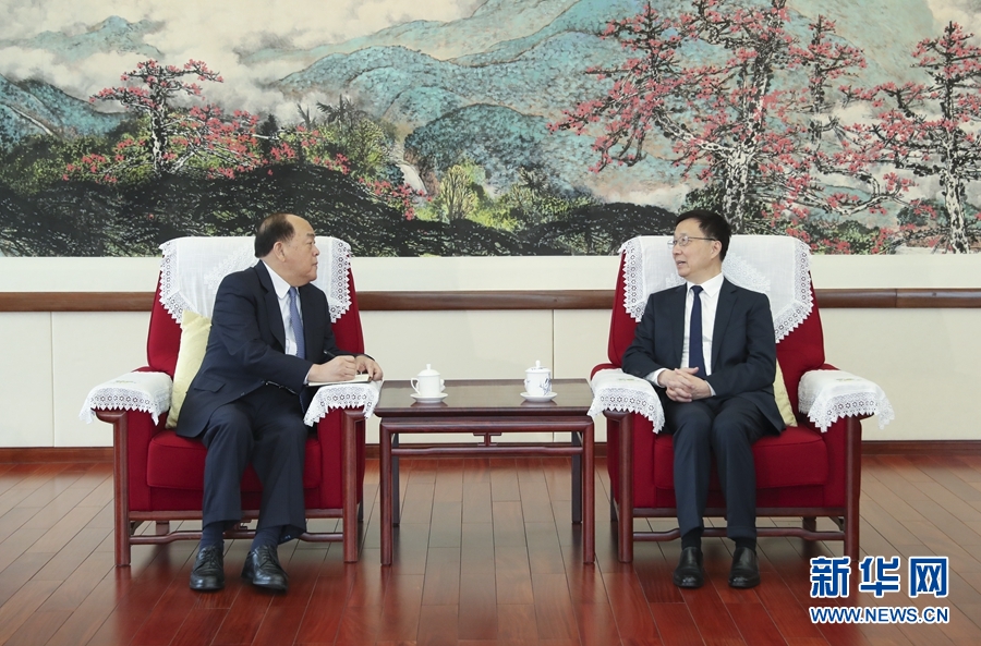 4月22日,中共中央政治局常委、國務(wù)院副總理韓正在廣州會(huì)見前來參加粵港澳大灣區(qū)建設(shè)領(lǐng)導(dǎo)小組會(huì)議的澳門特別行政區(qū)行政長官賀一誠。 新華社記者姚大偉攝