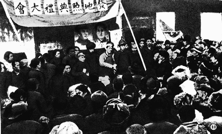 冀中農(nóng)民舉行擁護(hù)土地改革運(yùn)動大會。 新華社圖片