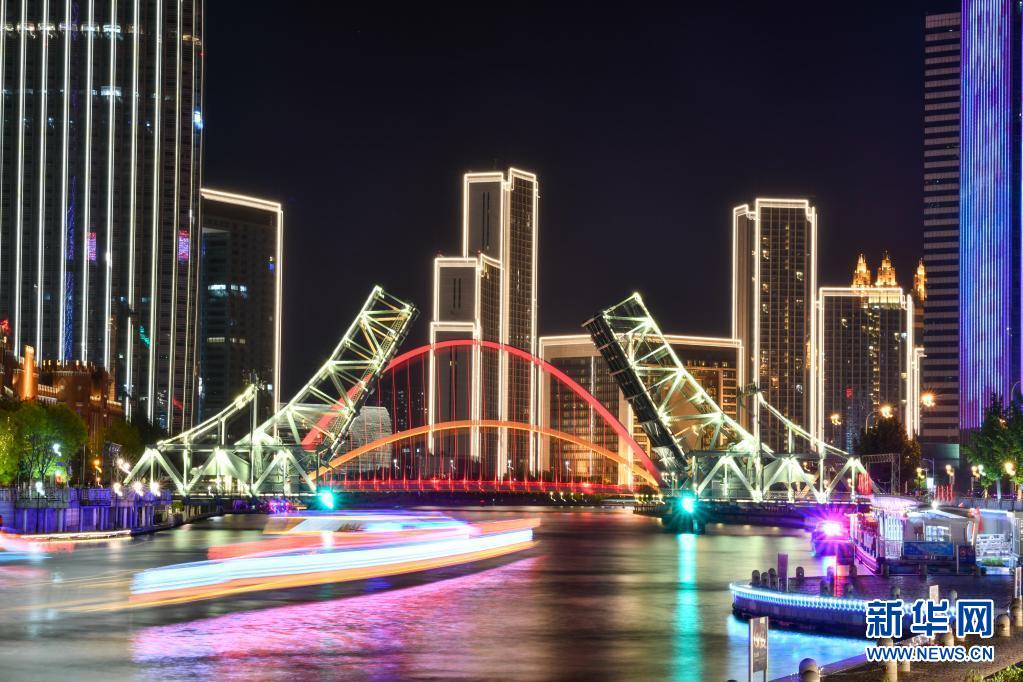 這是5月1日晚拍攝的天津解放橋景觀(長時(shí)間曝光照片)。新華社發(fā)(孫凡越 攝)