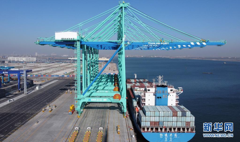 這是2021年1月17日拍攝的天津港北疆港區(qū)C段智能化集裝箱碼頭一號泊位(無人機(jī)照片)。新華社記者趙子碩 攝