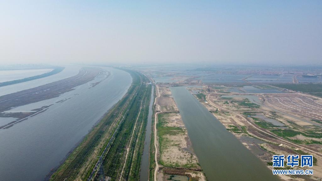 這是4月27日拍攝的天津獨(dú)流減河(左)與西西海生態(tài)濕地(右)(無人機(jī)照片)。新華社發(fā)(孫凡越 攝)