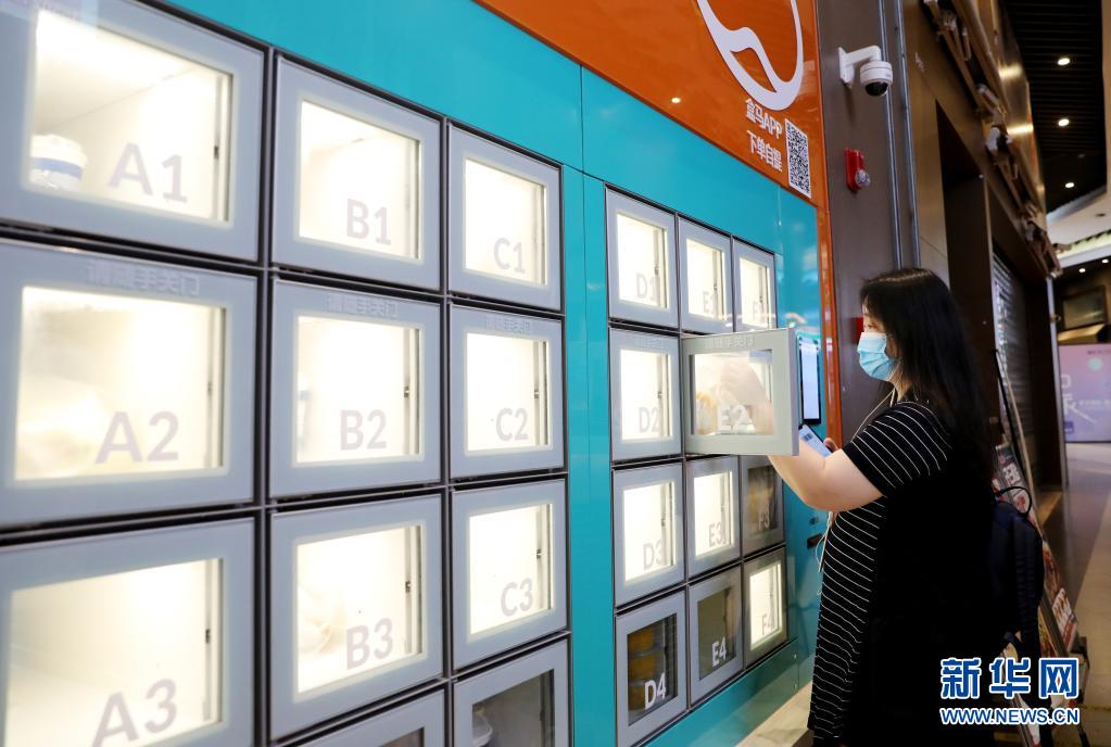 一位顧客通過APP掃碼,在上海地鐵13號線世博會博物館地鐵站附近的一家盒小馬服務(wù)點取餐柜中拿取預(yù)定的早餐(2020年7月17日攝)。新華社記者 方喆 攝