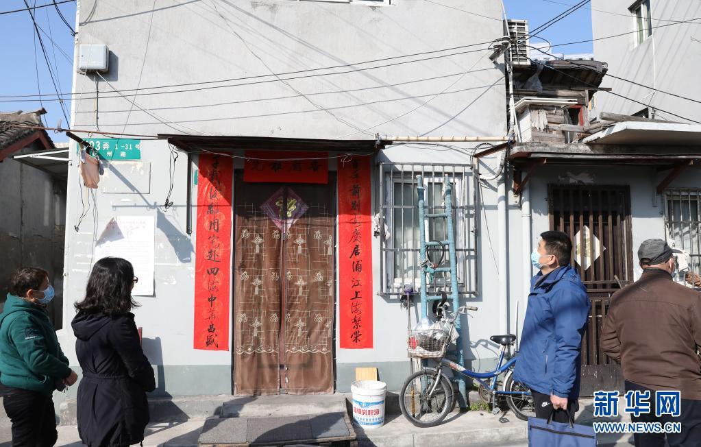 在上海楊浦區(qū)一處舊改動遷小區(qū),幾位居民被一戶人家門前貼出的對聯(lián)吸引(2020年12月9日攝)。新華社記者 方喆 攝