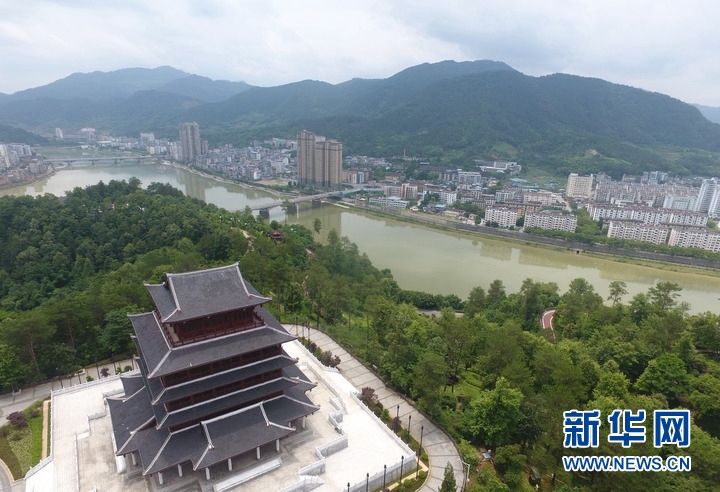 南平市順昌縣金溪和富屯溪兩溪交匯的觀靜山上的順昌閣和順昌縣城一角(無人機(jī)照片)。新華社記者林善傳攝