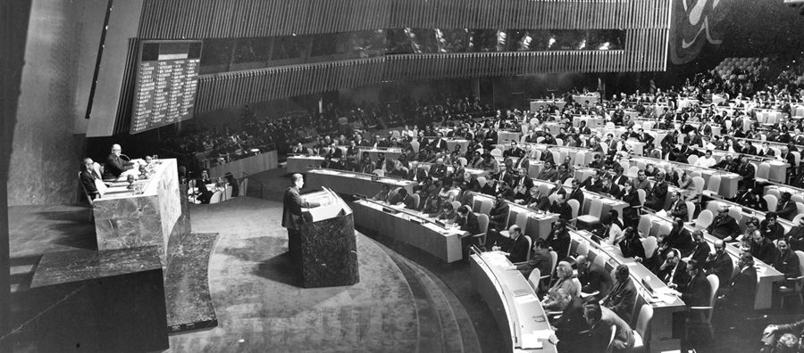 1971年9月,第二十六屆聯(lián)合國大會(huì)召開。從10月18日開始,聯(lián)合國大會(huì)就恢復(fù)中華人民共和國在聯(lián)合國的代表權(quán)問題進(jìn)行了一周的激烈辯論。10月25日,第二十六屆聯(lián)合國大會(huì)表決剛一結(jié)束,紐約聯(lián)合國會(huì)議大廳里立刻一片沸騰,雷鳴般的掌聲和歡呼聲一浪高過一浪,此起彼伏,經(jīng)久不息。新聞媒介評(píng)論道:“中國是在自己不在場(chǎng)的情況下,受到聯(lián)大三分之二以上國家的祝福,使聯(lián)合國發(fā)生根本變化?!?/p>