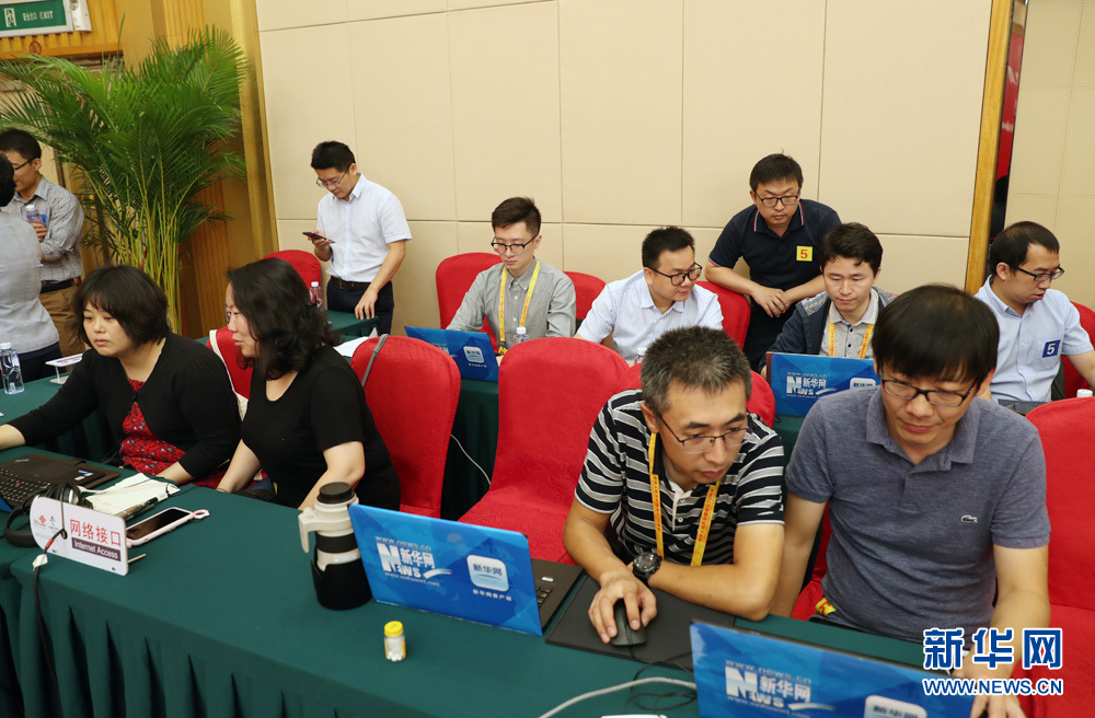 9月27日,慶祝中華人民共和國成立70周年活動新聞中心在梅地亞中心二層新聞發(fā)布廳舉辦第三場新聞發(fā)布會,中央農(nóng)村工作領(lǐng)導(dǎo)小組辦公室主任、農(nóng)業(yè)農(nóng)村部部長韓長賦,國務(wù)院扶貧開發(fā)領(lǐng)導(dǎo)小組辦公室主任劉永富介紹全面建成小康社會,扎實(shí)推進(jìn)脫貧攻堅(jiān)和鄉(xiāng)村振興,并回答記者提問。圖為新華網(wǎng)對發(fā)布會進(jìn)行現(xiàn)場直播。新華網(wǎng) 陳杰 攝