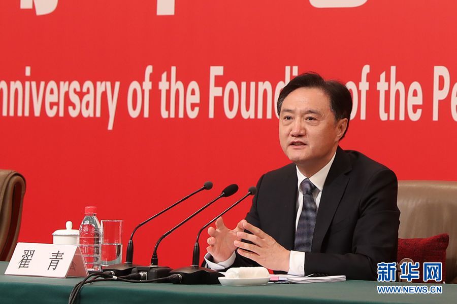 9月29日,慶祝中華人民共和國成立70周年活動(dòng)新聞中心在北京梅地亞中心二層新聞發(fā)布廳舉辦第四場新聞發(fā)布會(huì)。圖為生態(tài)環(huán)境部副部長翟青介紹相關(guān)情況。新華網(wǎng)記者 焦鵬 攝