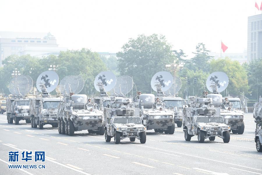 新華社北京10月1日電(記者李國利、李兵峰)身披數碼城市迷彩、高擎通信天線,由16輛國產新型裝備組成的信息作戰(zhàn)第3方隊,1日上午在孫寶泰少將、景賢舫少將的率領下整齊劃一通過天安門。