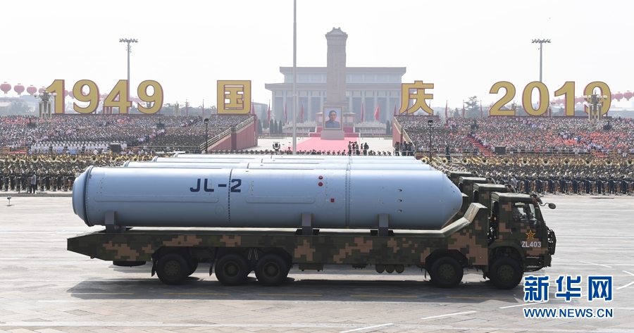 10月1日上午,慶祝中華人民共和國成立70周年大會在北京天安門廣場隆重舉行。這是巨浪-2導(dǎo)彈方隊(duì)接受檢閱。 新華社記者 高潔 攝