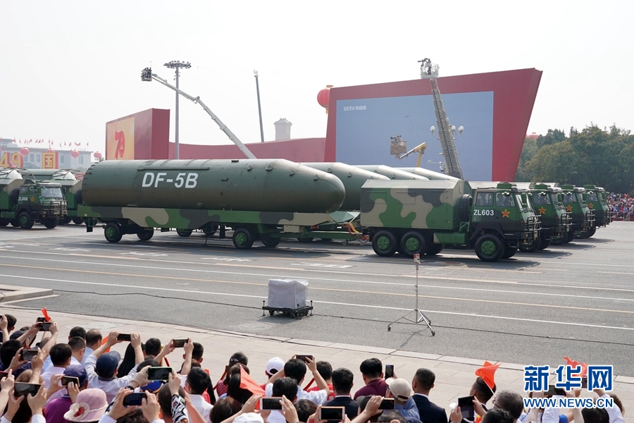 10月1日上午,慶祝中華人民共和國(guó)成立70周年大會(huì)在北京天安門廣場(chǎng)隆重舉行。這是東風(fēng)-5B核導(dǎo)彈方隊(duì)。 新華社記者 楊世堯 攝
