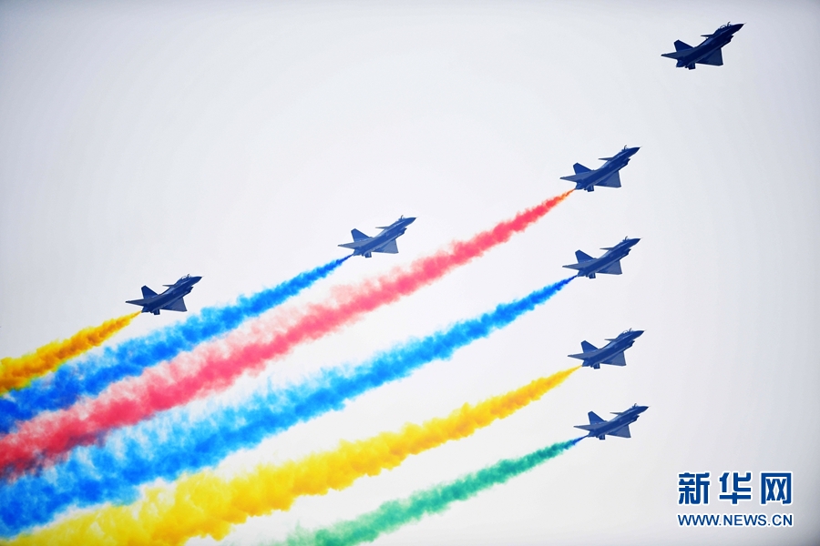 新華社北京10月1日電(張汨汨、周正新)1架空警-2000預(yù)警機(jī)和8架殲-10飛機(jī)組成領(lǐng)隊(duì)機(jī)梯隊(duì),10月1日飛臨天安門廣場上空接受檢閱。殲-10飛機(jī)拉出七道絢麗的彩煙,慶祝新中國成立70周年。