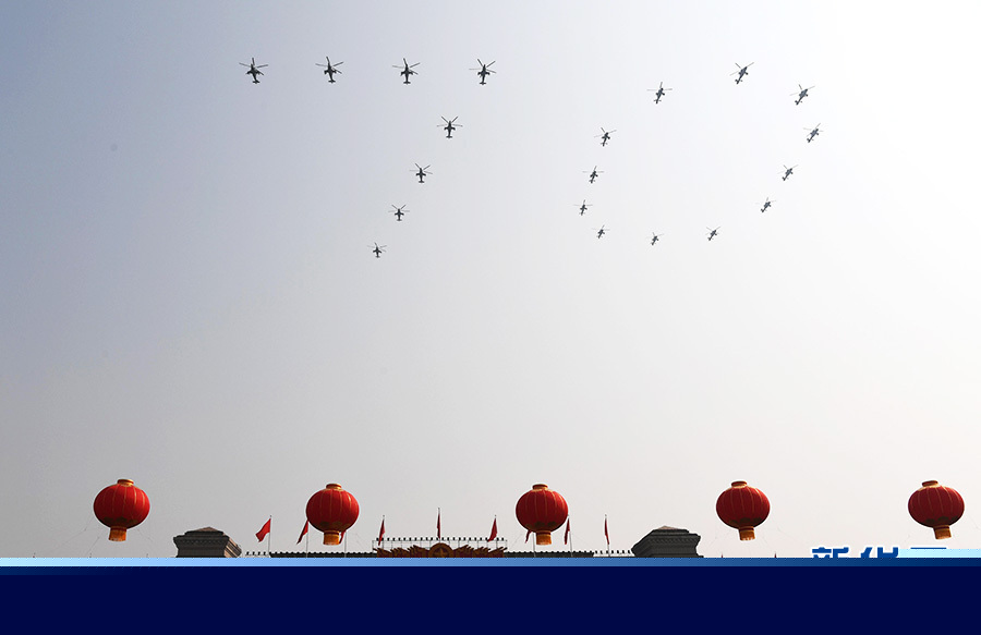 10月1日上午,慶祝中華人民共和國成立70周年大會在北京天安門廣場隆重舉行。 這是直升機在空中組成“70”字樣。 新華社記者 萬象 攝