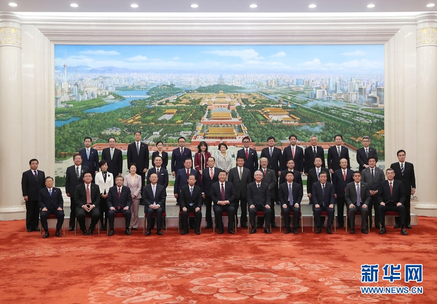 會見后,習(xí)近平與參加中日執(zhí)政黨交流機制第七次會議部分日方代表合影留念。