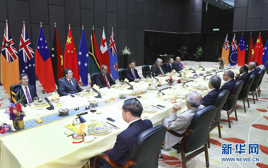 11月16日,國家主席習近平在莫爾茲比港同巴布亞新幾內亞總理奧尼爾、密克羅尼西亞聯(lián)邦總統(tǒng)克里斯琴、薩摩亞總理圖伊拉埃帕、瓦努阿圖總理薩爾瓦伊、庫克群島總理普納、湯加首相波希瓦、紐??偫硭冉ń惶窖髰u國領導人以及斐濟政府代表、國防部長昆布安博拉舉行集體會晤。習近平主持會晤并發(fā)表主旨講話。 新華社記者 龐興雷 攝