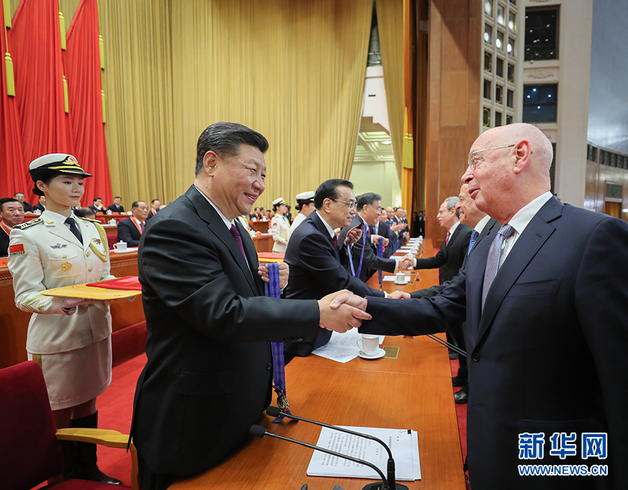 12月18日,慶祝改革開放40周年大會在北京人民大會堂隆重舉行。中共中央總書記、國家主席、中央軍委主席習近平在大會上發(fā)表重要講話。這是習近平等為獲得中國改革友誼獎章人員代表頒獎。 新華社記者 鞠鵬 攝