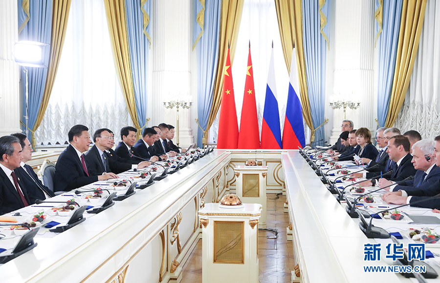 6月6日,國家主席習近平在莫斯科會見俄羅斯總理梅德韋杰夫。 新華社記者 姚大偉 攝
