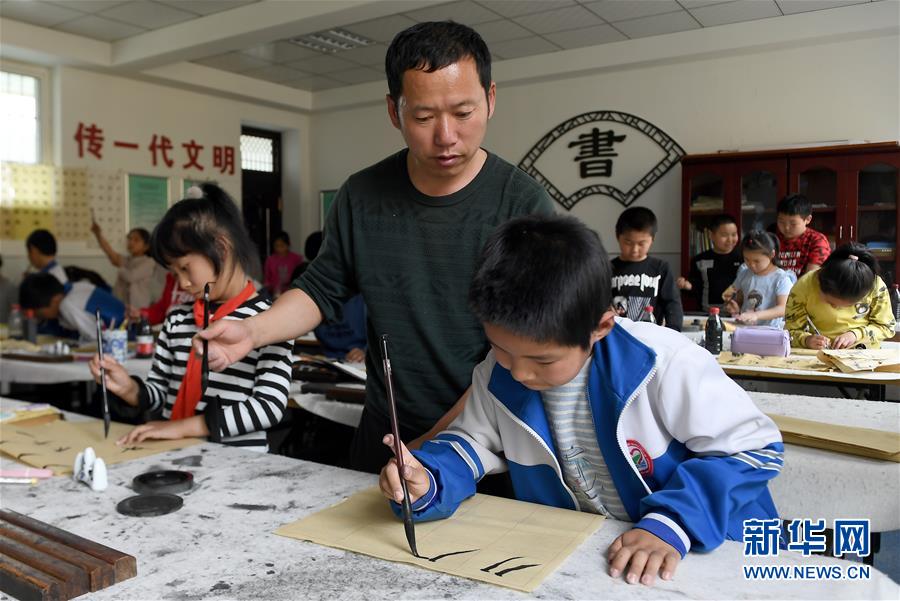 陜西省延安市楊家?guī)X福州希望小學(xué)書(shū)法社團(tuán)的學(xué)生在老師指導(dǎo)下練習(xí)書(shū)法(4月24日攝)。新華社記者 劉瀟 攝
