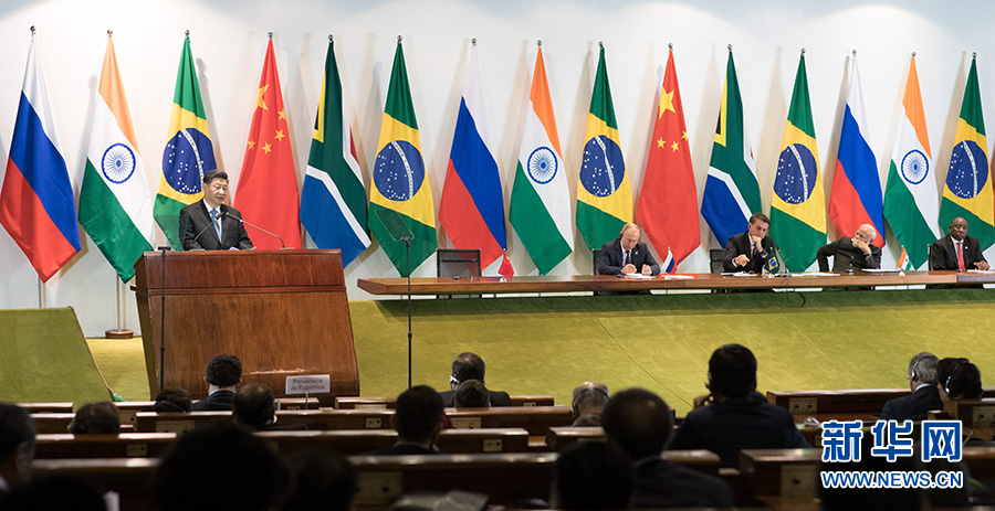 當?shù)貢r間11月14日,金磚國家領(lǐng)導人同金磚國家工商理事會和新開發(fā)銀行對話會在巴西利亞舉行。中國國家主席習近平、巴西總統(tǒng)博索納羅、俄羅斯總統(tǒng)普京、印度總理莫迪、南非總統(tǒng)拉馬福薩共同出席。這是習近平發(fā)表講話。 新華社記者 王曄 攝