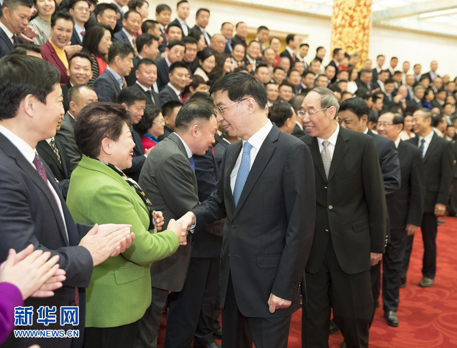 上午9時(shí)30分,王滬寧來(lái)到人民大會(huì)堂金色大廳,同代表們親切握手,并合影留念。