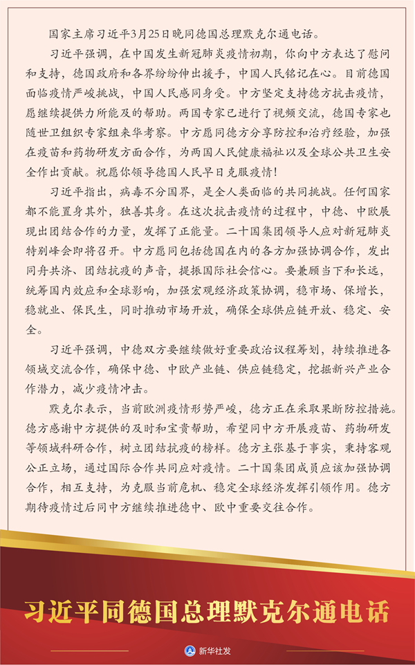 習(xí)近平指出,病毒不分國(guó)界,是全人類面臨的共同挑戰(zhàn)。任何國(guó)家都不能置身其外,獨(dú)善其身。在這次抗擊疫情的過(guò)程中,中德、中歐展現(xiàn)出團(tuán)結(jié)合作的力量,發(fā)揮了正能量。二十國(guó)集團(tuán)領(lǐng)導(dǎo)人應(yīng)對(duì)新冠肺炎特別峰會(huì)即將召開(kāi)。中方愿同包括德國(guó)在內(nèi)的各方加強(qiáng)協(xié)調(diào)合作,發(fā)出同舟共濟(jì)、團(tuán)結(jié)抗疫的聲音,提振國(guó)際社會(huì)信心。要兼顧當(dāng)下和長(zhǎng)遠(yuǎn),統(tǒng)籌國(guó)內(nèi)效應(yīng)和全球影響,加強(qiáng)宏觀經(jīng)濟(jì)政策協(xié)調(diào),穩(wěn)市場(chǎng)、保增長(zhǎng),穩(wěn)就業(yè)、保民生,同時(shí)推動(dòng)市場(chǎng)開(kāi)放,確保全球供應(yīng)鏈開(kāi)放、穩(wěn)定、安全。