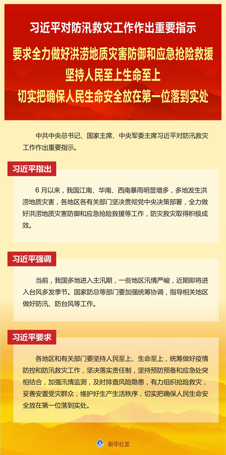習(xí)近平要求,各地區(qū)和有關(guān)部門(mén)要堅(jiān)持人民至上、生命至上,統(tǒng)籌做好疫情防控和防汛救災(zāi)工作,堅(jiān)決落實(shí)責(zé)任制,堅(jiān)持預(yù)防預(yù)備和應(yīng)急處突相結(jié)合,加強(qiáng)汛情監(jiān)測(cè),及時(shí)排查風(fēng)險(xiǎn)隱患,有力組織搶險(xiǎn)救災(zāi),妥善安置受災(zāi)群眾,維護(hù)好生產(chǎn)生活秩序,切實(shí)把確保人民生命安全放在第一位落到實(shí)處。